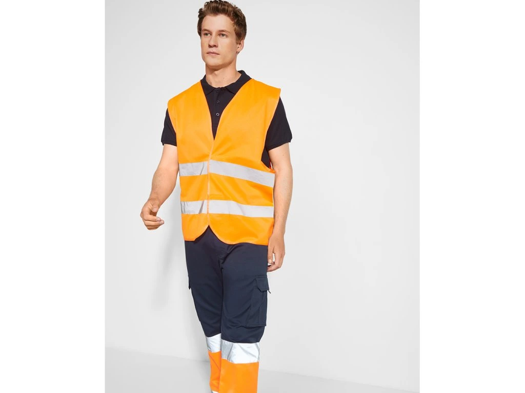 Reflexní vesta. Dva reflexní pásy zaručující vysokou viditelnost. Výstřih do V a nastavitelné zapínání na suchý zip. Certifikace CE podle norem: UNE-EN ISO 13688:2013/A1:2021 a UNE-EN ISO 20471:2013/A1:2017. Třída II.