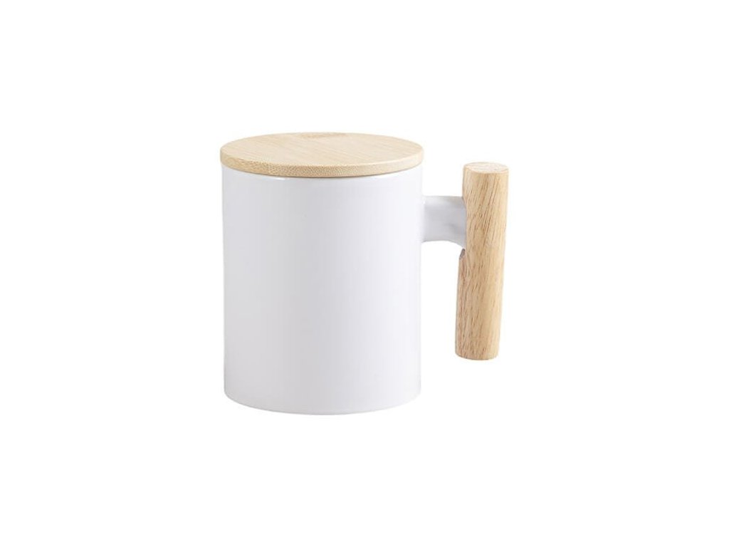 Keramický hrnek s dřevěnou rukojetí a víčkem pro sublimační potisk.