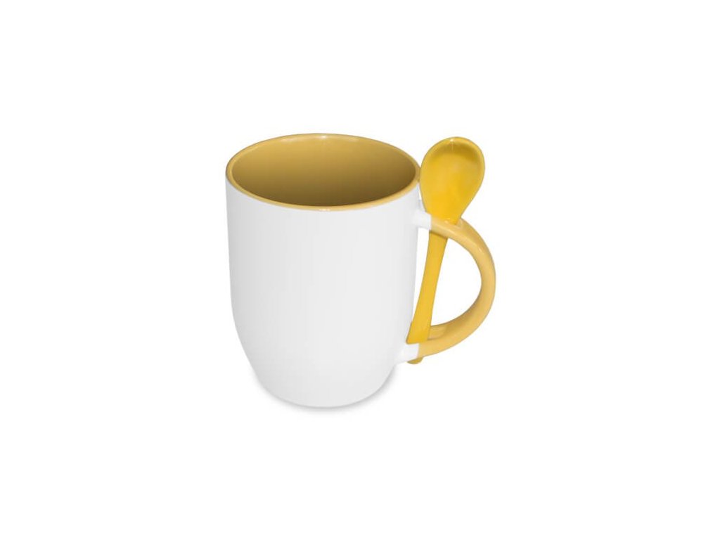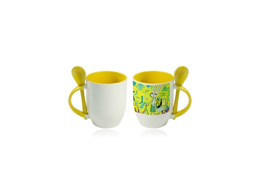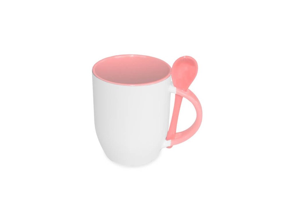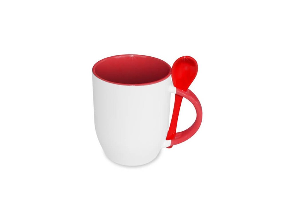 Bílý keramický hrnek s barevným vnitřkem a lžičkou třídy JS Coating je díky polyesterové vrstvě ideální na sublimaci.