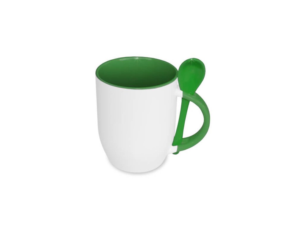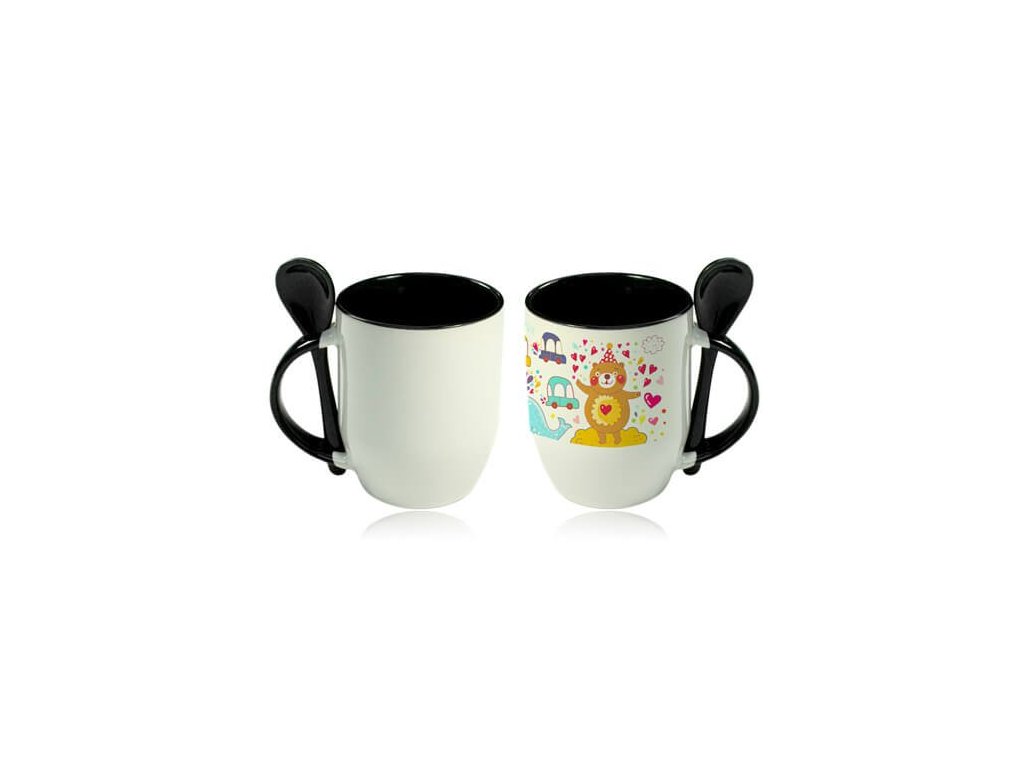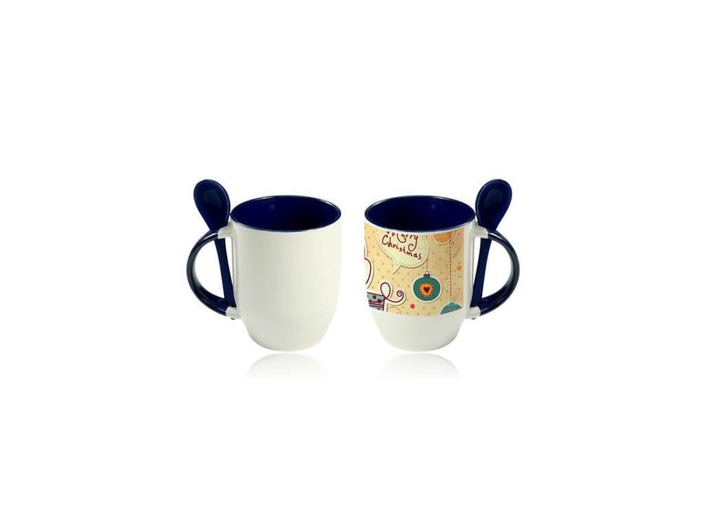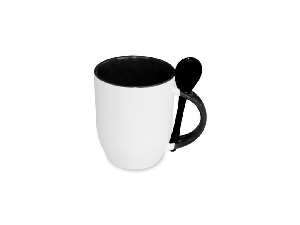 Bílý keramický hrnek s barevným vnitřkem a lžičkou třídy JS Coating je díky polyesterové vrstvě ideální na sublimaci.